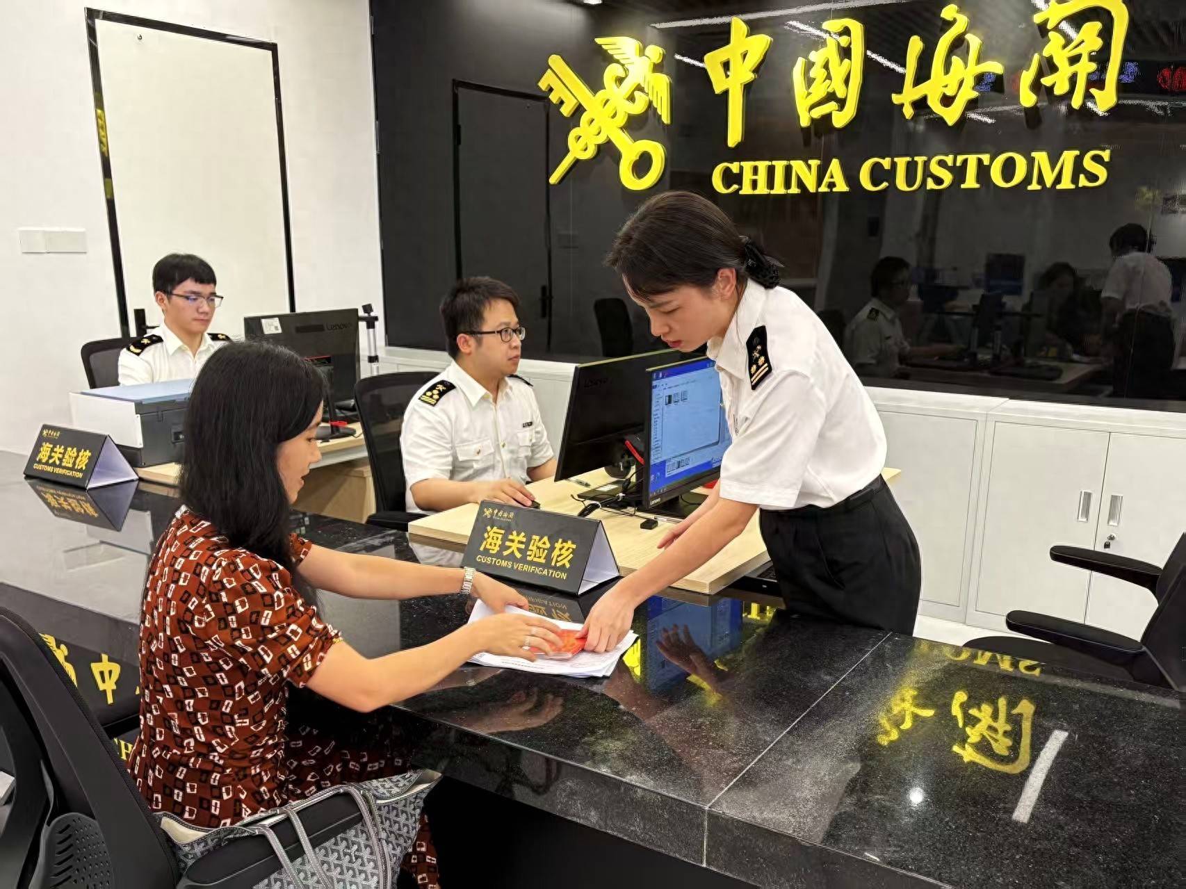 罗湖口岸首单离境退税业务办理现场。(深圳海关供图) 今年上半年,深圳离境退税规模迅速增长,退税商品销售额、办理业务量,分别同比增长1.6倍、3.9倍,大疆、华为等深圳国货潮品业务占比34.5%,占比全国第一。目前,深圳退税商店累计超过1000家,“即买即退”商圈12个,位居全国前列;离境退税口岸持续扩围,增设福田口岸、深圳湾口岸离境退税点,成为全国离境退税口岸数量最多、类型最全城市;离境退税服务水平大幅提升,全国首推“一单一包”便利化模式,单笔业务办理时长压缩一半以上,上线退税“云服务”平台,实现退税办理“秒到账”“零等待”。